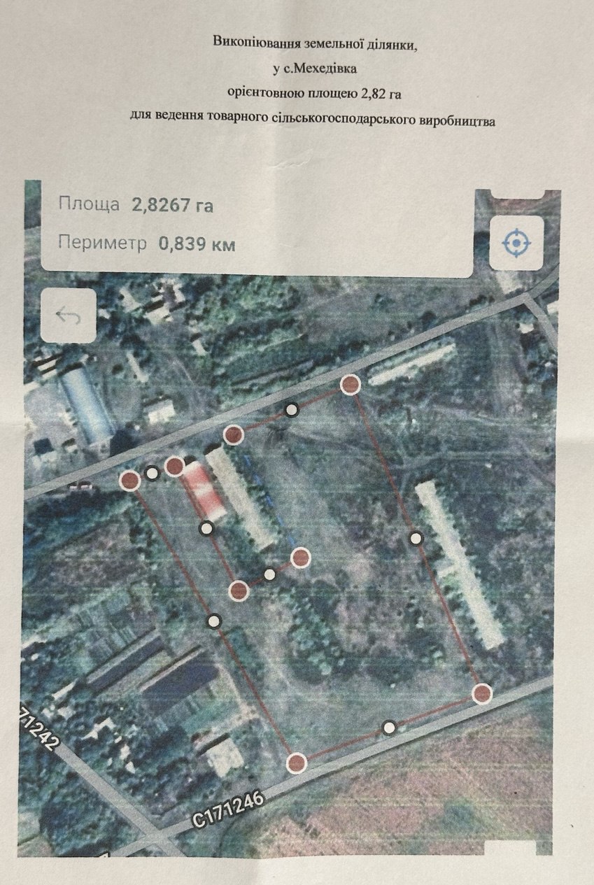Фактична площа земельної ділянки з самовільним “самобудом” (виділено червоним) земельної ділянки у Мехедівці. Є й ще одна – через дорогу.
