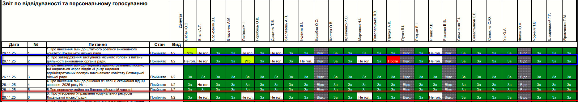 На жаль, керівництво Лохвицької міськради, схоже, не зацікавлене у тому, щоб глядачі трансляції могли розібрати, хто саме за що голосував. Тому камера трансляції не сфокусована на екрані с результатами голосування. А коли екран все ж таки потрапляє в кадр – то на якусь мить, щоб ніхто нічого не міг розгледіти.